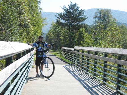 A unicyclist stops for a quick rest and a photograph on one of the five bridges that cross over Terrapin Creek.