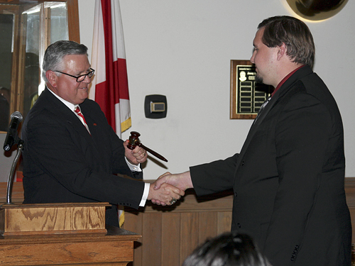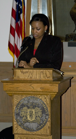 The JSU Student Government Association held its annual awards banquet on Monday, April 6 at the Gamecock Center. In addition to recognizing the students who served the university during the past year through SGA participation, the gavel was officially passed to new leaders for 2009-2010. In the top photo, Dr. Bill Meehan presents the gavel to incoming SGA President T. Bryant Whaley. Below, outgoing SGA President Jennifer Nix gives her farewell speech. Photos are courtesy of the SGA.