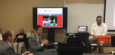 Photo: John Merrill (second from left) addresses the Center after hearing Mark Hopwood's (right) presentation (JSU courtesy).