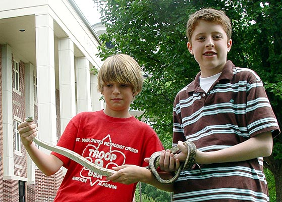 A graduate student who became mildly alarmed after encountering a nonpoisonous rat snake (Elaphe obsoleta spiloides) on a sidewalk near McGee Hall said she unintentionally set into action a search and rescue mission after mentioning the snake to a group of biology students in the building. Moments later, excited faculty, staff, and students were rushing around grabbing containers, a pillow case, and a snake stick. They ran outside and were able to round up the reptile for a return to the wild. Biologist Pete Conroy, director of the Environmental Policy and Information Center, led the way and captured the gray and yellow marked snake with his bare hands just before it slithered onto Bennett Boulevard. It has now been returned to the wild by Field School assistants Brad Johnson and Josh Morrison (photographed above). (Photo by Renee Morrison)